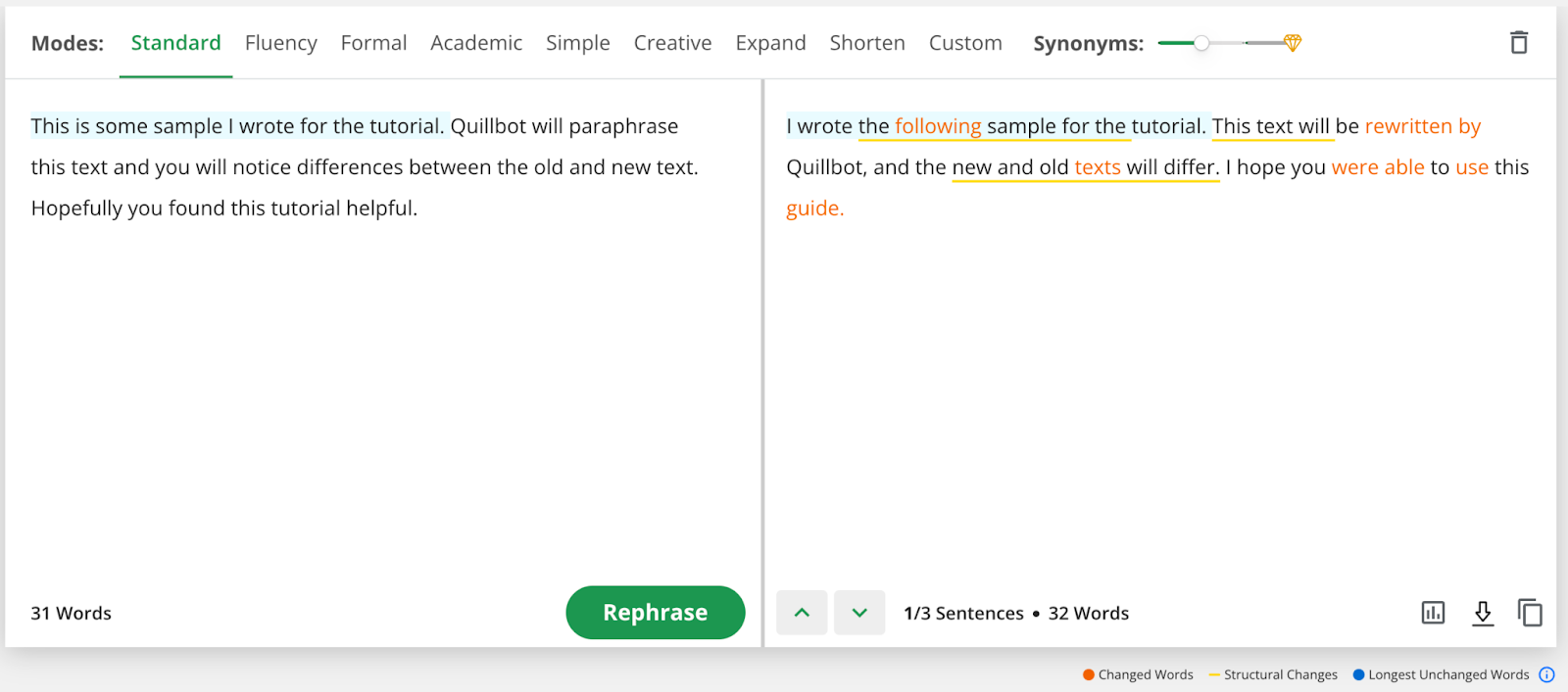 * Flexibility: The best part of using this tool is that you are not limited with word count, and thus you are able to experiment with different paraphrasing settings.